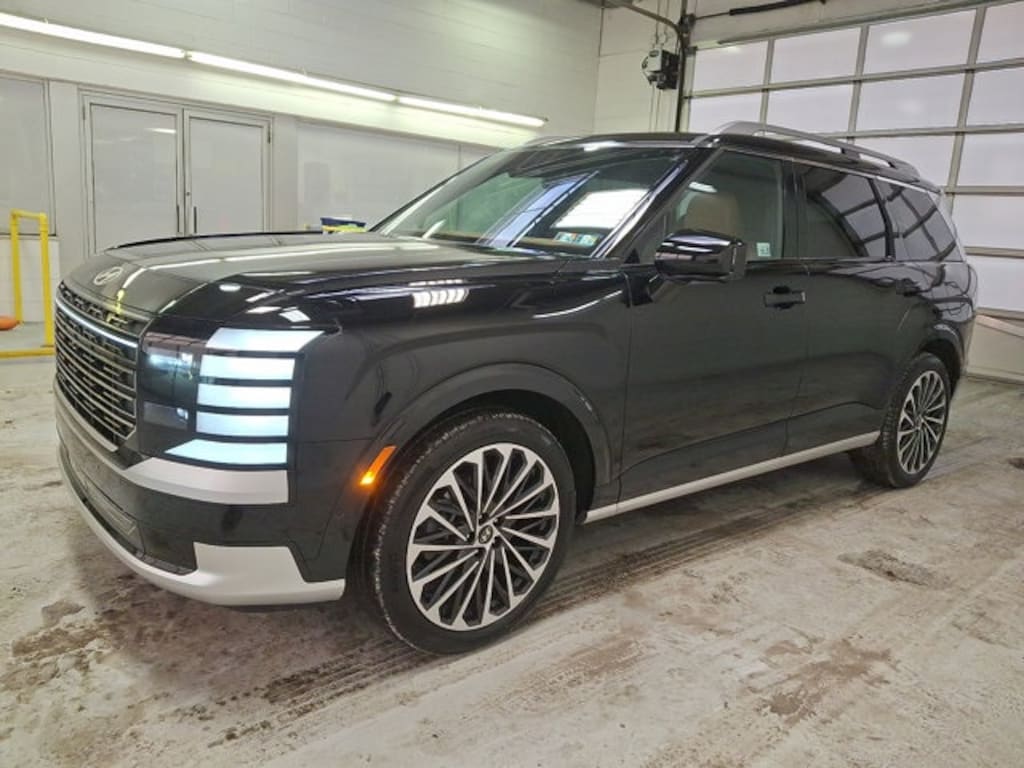 Option Group 01, Hyundai Certified Used Vehicles Certified, 14 Speakers, 3rd row seats: split-bench, 4-Wheel Disc Brakes, ABS brakes, Air Conditioning, All-Season Fitted Liners, Alloy wheels, AM/FM radio: SiriusXM, Apple CarPlay & Android Auto, Audio memory, Auto High-beam Headlights, Auto-dimming door mirrors, Auto-dimming Rear-View mirror, Auto-leveling suspension, Automatic temperature control, Brake assist, Bumpers: body-color, Cargo Net, Cargo Tray, Carpeted Floor Mats, Compass, Delay-off headlights, Driver door bin, Driver vanity mirror, Dual front impact airbags, Dual front side impact airbags, Electronic Stability Control, Emergency communication system: None, Exterior Parking Camera Rear, First Aid Kit, Four wheel independent suspension, Front anti-roll bar, Front Bucket Seats, Front Center Armrest, Front dual zone A/C, Front reading lights, Fully automatic headlights, Garage door transmitter: HomeLink, Genuine wood console insert, Genuine wood dashboard insert, Heads-Up Display, Heated and Ventilated Front Bucket Seats, Heated door mirrors, Heated front seats, Heated rear seats, Heated steering wheel, HVAC memory, Illuminated entry, Knee airbag, Leather steering wheel, Low tire pressure warning, Memory seat, Navigation System, Occupant sensing airbag, Outside temperature display, Overhead airbag, Overhead console, Panic alarm, Passenger door bin, Passenger vanity mirror, Power door mirrors, Power driver seat, Power Liftgate, Power moonroof, Power passenger seat, Power steering, Power windows, Premium Nappa Leather Seat Trim, Radio data system, Radio: Infotainment Navigation System, Rain sensing wipers, Rear air conditioning, Rear anti-roll bar, Rear audio controls, Rear reading lights, Rear side impact airbag, Rear window defroster, Rear window wiper, Reclining 3rd row seat, Remote keyless entry, Security system, Speed control, Split folding rear seat, Spoiler, Steering wheel mounted audio controls, Tachometer, Telescoping steering wheel, Tilt steering wheel, Traction control, Trip computer, Turn signal indicator mirrors, Variably intermittent wipers, Ventilated front seats, Ventilated rear seats, and Wheels: 21" x 8.5J Alloy. Recent Arrival!